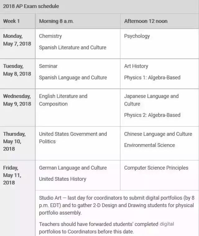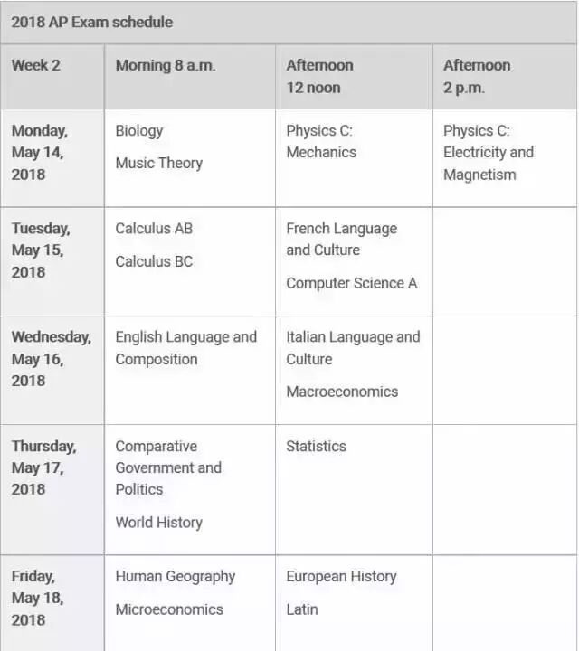 今年的AP成绩出来后,Collegeboard又迅速公布了2018年AP各科考试的时间安排: