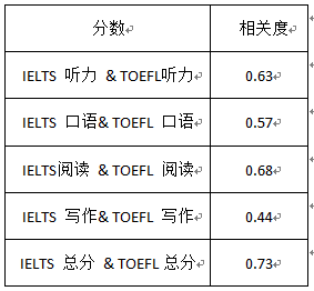 根据TOEFL分数和IELTS分数的相关性检验来讲,如下表2: