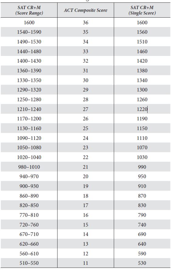 上表中的数据来自美国大学理事会(CollegeBoard),其中SAT分数只包含阅读和数学两部分的分数。从表中我们可以看出,一个既定的ACT成绩对应SAT分数的一个区间段,比如ACT 31分对应的SAT分数段是1360-1390。SAT和ACT分值对应表为美国大学评估参加不同类型“美式高考”学生的综合知识能力提供了量化分析的依据。可以这样说,特定SAT分数段内的学生与对应ACT分数的学生在英文能力、知识水平以及思维能力等学术能力方面是相差不大的。但是应当注意的是,该分值对应表并不意味着:如果一名考生的SAT考到了1540-1590之间分数,那么该名考生的参加ACT考试一定会取得35分的成绩。