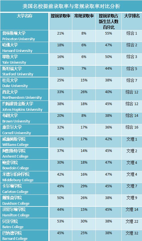 下面是燕定美中小编,根据美国新闻网站The Daily Beast提供的数据整理而出的“美国名校提前录取率和常规录取率的对比分析“,希望对打算申请美国大学的小伙伴们有一些参考意义。