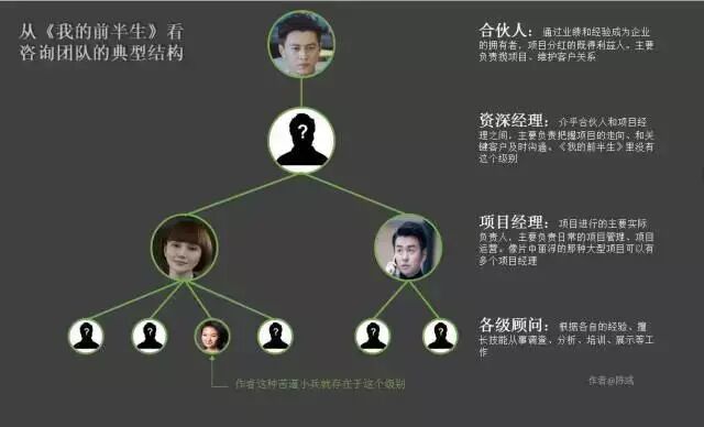 赢下一个客户的项目后,公司会派出一个跟项目大小相符合的团队开展市场调查、数据分析、专访等工作。不过需要注意的是,见客户、商量方案的顾问们只组成了一个咨询公司的“前台”,一个成熟的公司还有“中台”(包括美术处理、数据收集等职能,片中的凌玲就属于这里),“后台”(包括财务、HR、法务等部门)。 一个前台项目的成功少不了中台、后台的支持。