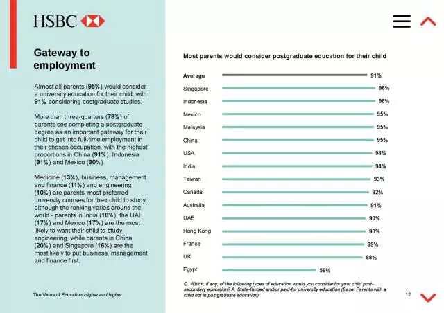 95%的中国家长考虑让孩子读研究生,这个水平高于全球平均值。