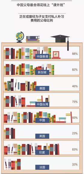 在私人辅导方面,中国排在首位,93%的父母给孩子请私人辅导。
