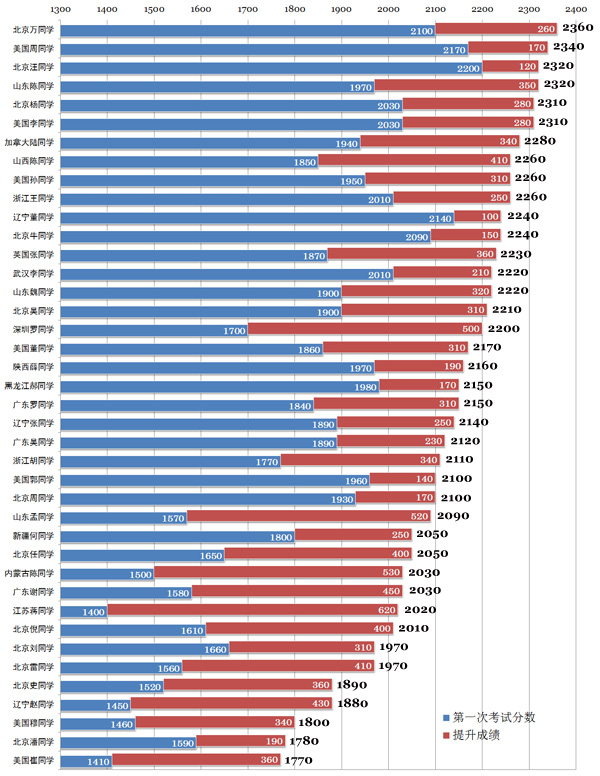 答:几位高一就开始参加培训的学生全都做完了“百套考题”,他们全都考到2300以上。其实真正有耐心把百套考题都学完的学生并不多,不少学生没有做完100套题也考到2200、2300分以上。